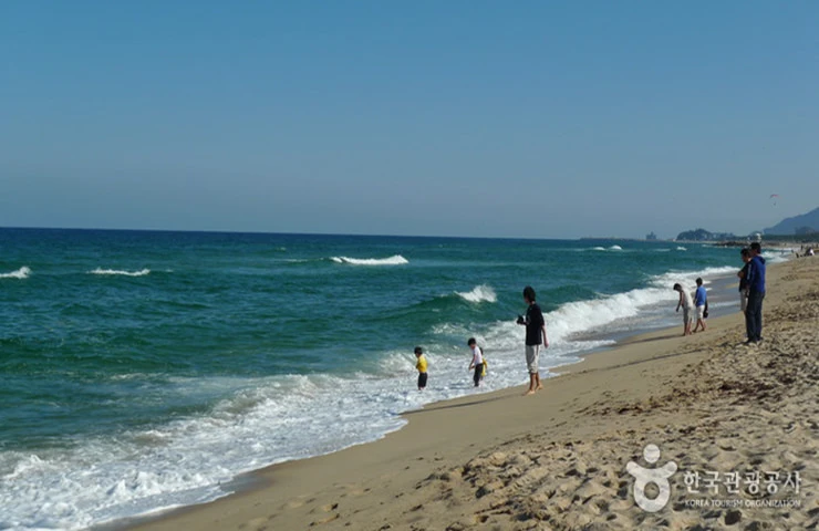 동해안 최대 해변으로 유명하며, 강문동, 안현동에 있고 시내에서 북으로 6km, 경포대에서 1km되는 곳에 동해의 창파를 가득 담고 펼쳐진 명사오리(明沙五里)이다. 모두를 삼키기라도 하려는 듯 밀려오는 파도, 이를 쓸어 안은 길이1.8km, 면적1.44㎢의 하얀 모래밭과, 시끄러운 일상을 조용히 차단하는 울창한 송림병풍의 조화가 해변 특유의 아름다움을 자아낸다. 자료출처 - 대한민국 구석구석(http://korean.visitkorea.or.kr) 펜션에서 총 4.2km, 차량으로 약 5분